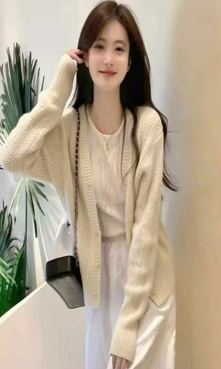 春秋新款设计感镂空钩花短款宽松针织毛衣开衫,独立包装,均码面料软糯舒适...