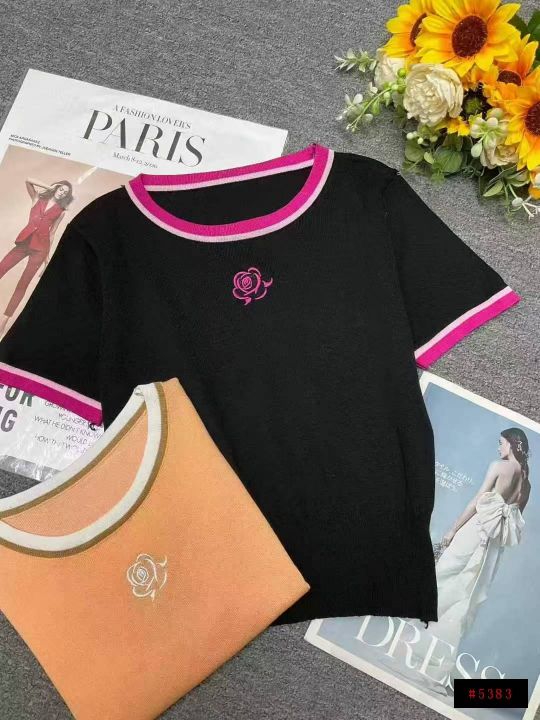 夏季新款撞色边玫瑰刺绣收腰显瘦针织短袖t桖,独立包装,均码面料柔软舒适...