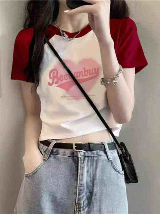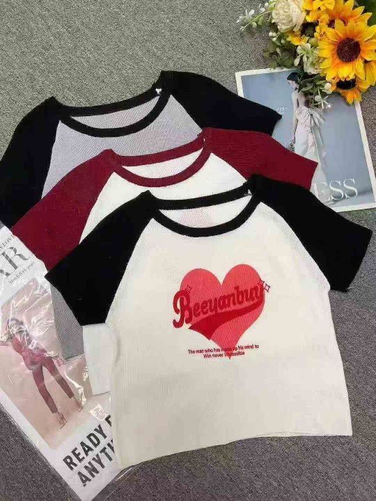 夏季新款甜辣妹提花小众减龄bm别致插肩爱心字母针织短袖T桖,独立包装,均...