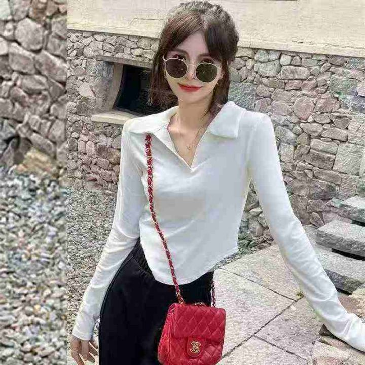 1200件韩系辣妹polo领显瘦露脐紧靓妹长袖T恤,尺码xs-XL ,面料软糯高弹力...