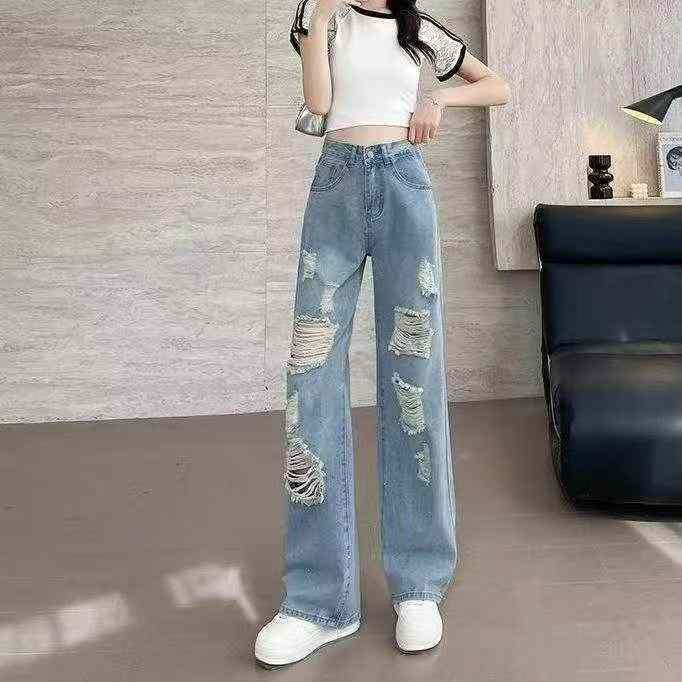 春夏季新款网红复古破洞牛仔直筒阔腿裤,独立包装带吊牌,码数27-31-32码(...