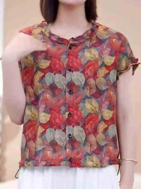 妈妈装枫叶印花木耳边短袖衬衫女2026夏季新款小衫宽松显瘦上衣码数:1-3码...
