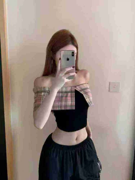 复古格纹一字肩短袖64件7.5,面料舒适透气,有弹力,格纹拼接设计,码数1-3...