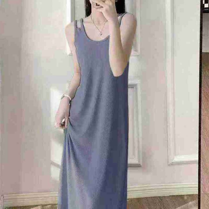 韩版时尚螺纹冰丝吊带连衣裙.单款两个色M-XL100条独立包装全清5.8不分货...