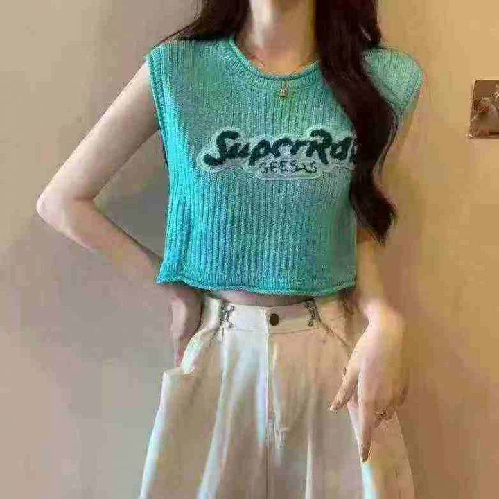 清货3.9元纯欲甜辣短款字母刺绣针织背心女夏季外穿宽松无袖t恤洋气小衫女,...