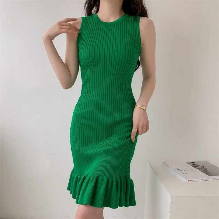 春夏季新款外贸原单美式复古坑条包芯纱荷叶边针织背心连衣裙,独立包装,码...
