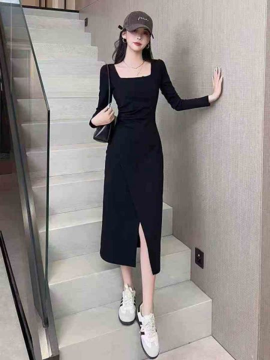 ☕️法式黑色方领开叉长袖连衣裙女秋季新款收腰显瘦长裙赫本风小黑裙200件...