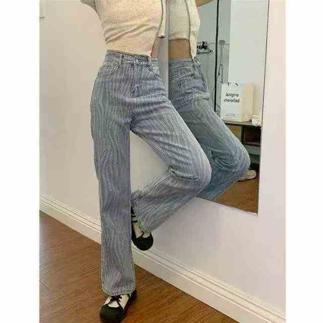 茵曼秋季高腰波浪纹阔腿牛仔裤日常通勤风宽松显瘦显高垂坠长裤,独立包装,...