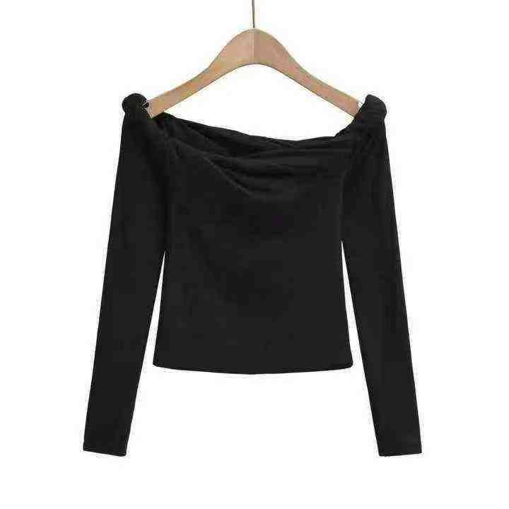 辣妹一字肩 黑色长袖t恤 女秋季短款 修身打底衫高级性感露肩上衣 螺纹面料 ...