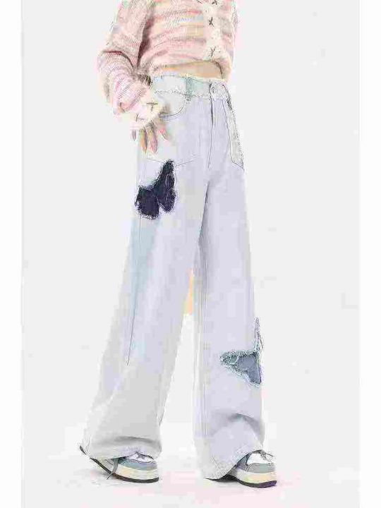 天猫精选1500条 时尚洋气国潮蓝色蝴蝶刺绣毛边阔腿牛仔裤女,单款单色S~XL...