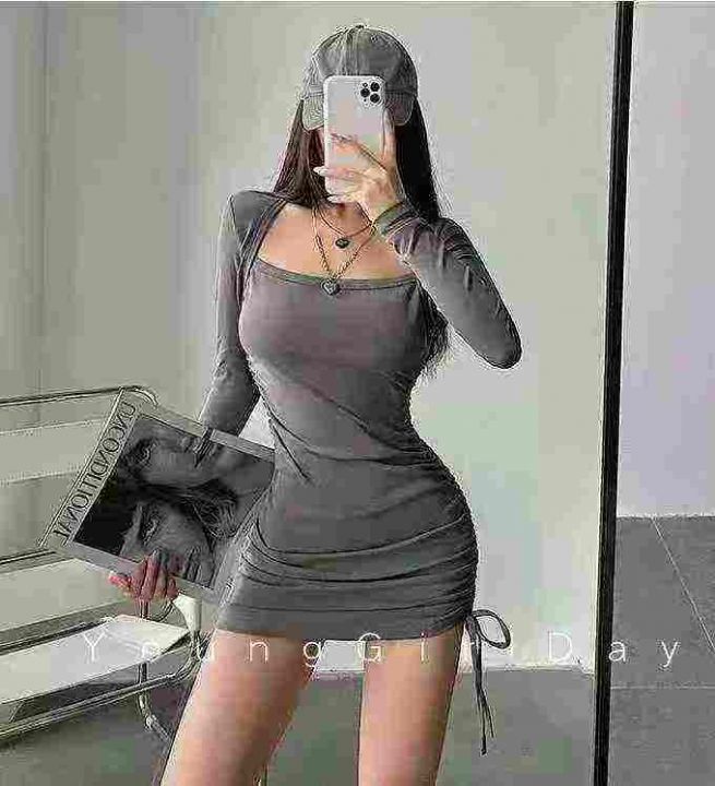 性感修身包肩长袖连衣裙60件7.9,露锁骨,抽绳褶皱,码数S-M-XL-2XL,独立...