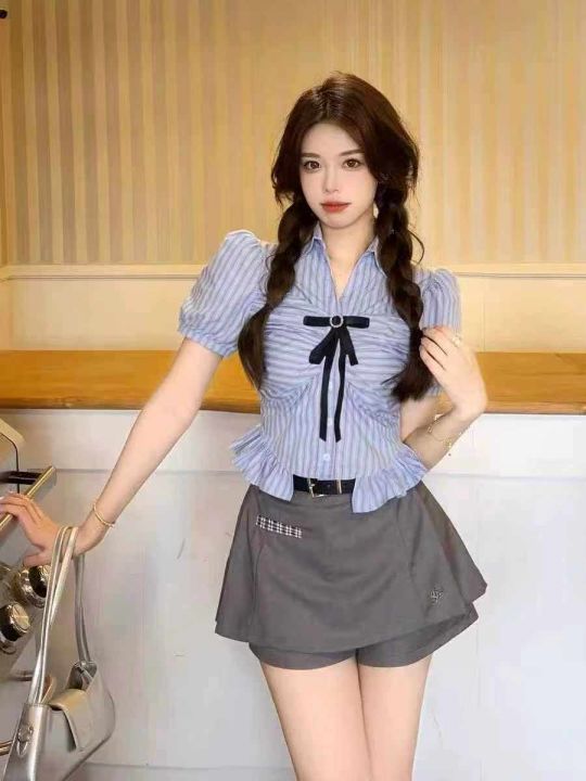 [月亮]:7.8清410件[月亮]:学院风褶皱蓝色条纹纽扣辣妹衬衫[月亮]:1234码...