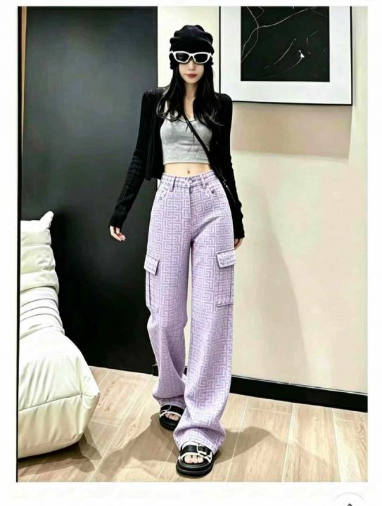 夏季新款设计感提花高腰显瘦气质百搭多袋直筒阔腿工装牛仔裤,独立包装带腰...