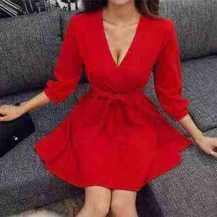 ① 春季大码女装名媛气质V领系带连衣裙!独立包装,码数XL-3Xl,数量100件...
