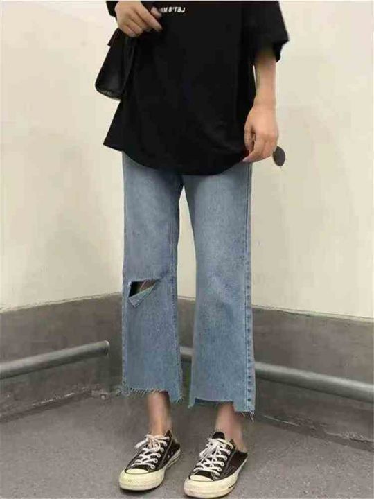 大码破洞牛仔裤女高腰胖mm显瘦梨型身材直筒裤子宽松九分阔腿裤300件,独立...