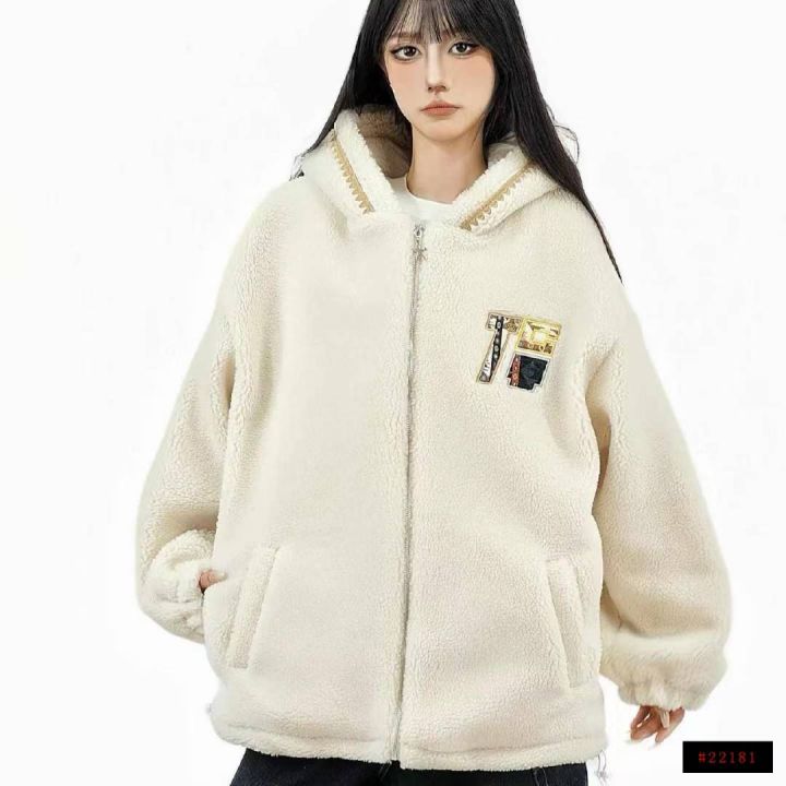 秋冬新款加绒(一体绒)可爱卡通软妹新款宽松百搭保暖羊羔毛连帽拉链外套,...