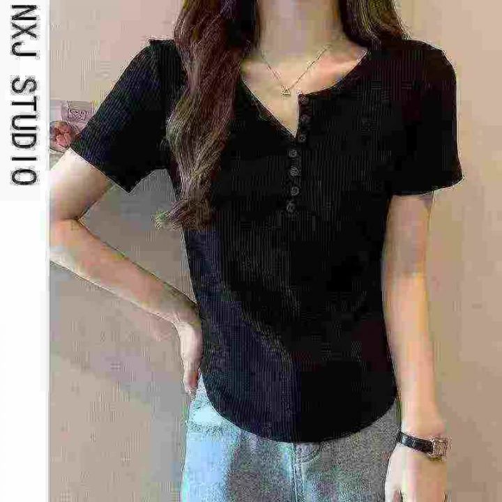 ☆5.8元,粗条冰丝辣妹T,夏季韩版修身短袖排扣靓妹T恤,透气舒适,150件,...