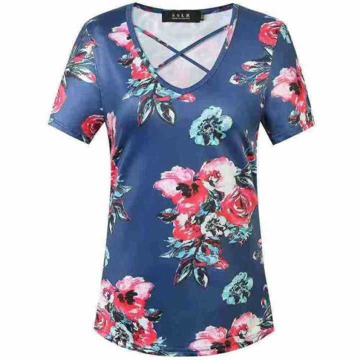 外贸原单V领交叉绑带印花短袖T恤约1500件,整单XS~XL码十几种底色不同花型...