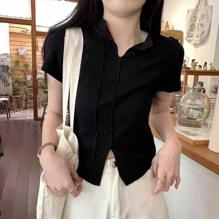 328件复古ins夏季正肩短袖t恤女修身显瘦辣妹短款法式别致开叉V领上衣,面料...