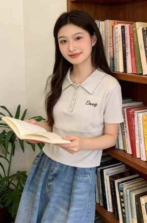 夏季新款美式学院风辣妹小众冰丝弹力修身显瘦polo领短袖T恤,独立包装,码...