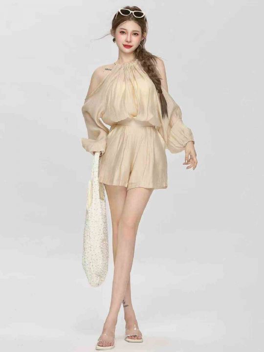 夏季新款法式高级感气质露肩时尚棉绸衬衣+棉绸短裤,独立包装,码数S--XL码...