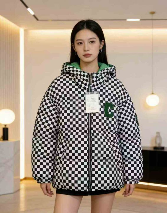 全清31.8元,100件左右 羽绒棉服女装冬季,千鸟格防寒保暖印花棉袄时尚高级...