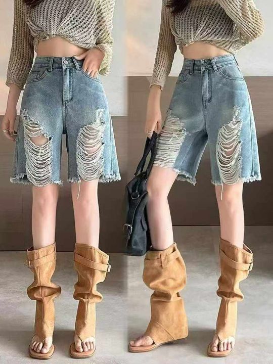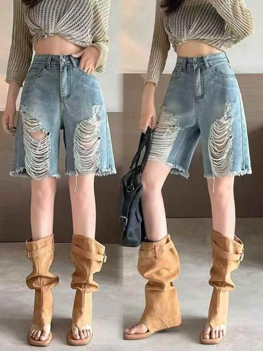 夏季新款男女同款破洞设计款阔腿牛仔短裤,独立包装,码数S- 2XL码,1400件...