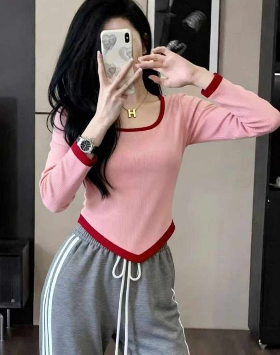 秋冬新款撞色高腰设计不规则纯欲风短款针织套头毛衣,独立包装,均码面料柔...
