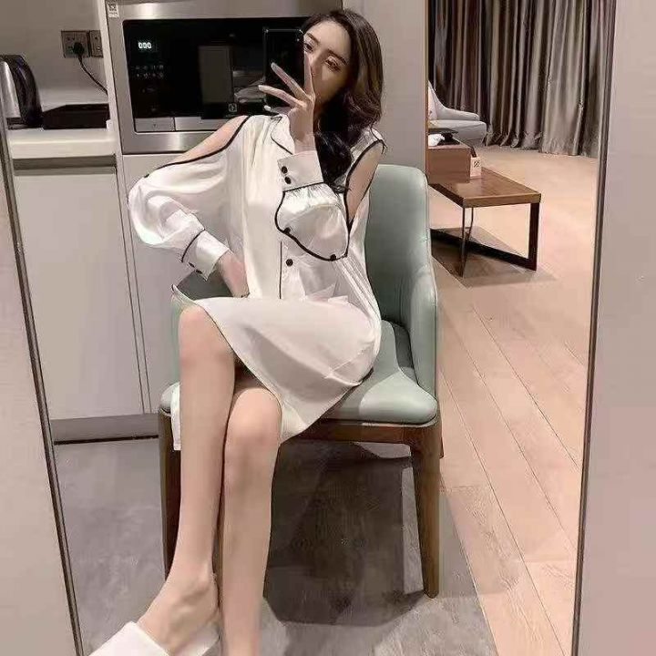 ① 网红冰丝性感露肩韩版宽松家居睡裙!独立包装,整款五色,有部分长袖款...