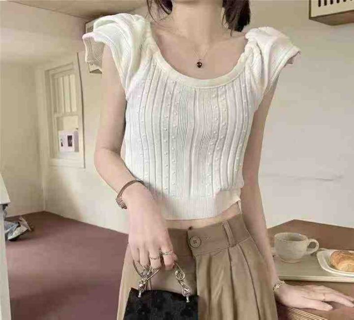 一字领泡泡短袖针织衫法式设计感小众性感短款露肩上衣,独立包装,均码,11...