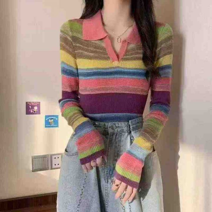 秋季新款POLO领撞色彩虹条纹微胖MM设计感时尚宽松长袖套头毛衣羊毛衫,独立...