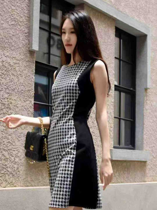 夏季新款立体剪裁拼接撞色带镶钻千鸟格修身圆领女士无袖背心连衣裙 独立包...