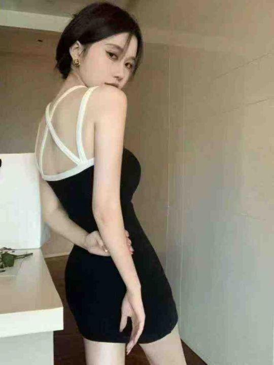 辣妹黑色撞色吊带连衣裙女装夏季新款性感露背修身无袖收腰包臀裙 独立包装 ...