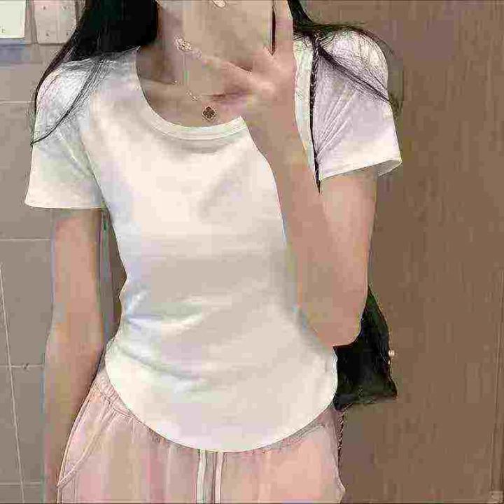 新款不规则短袖复古气质圆领修身弧形下摆螺纹T恤女,整款4色,有后领包边,...