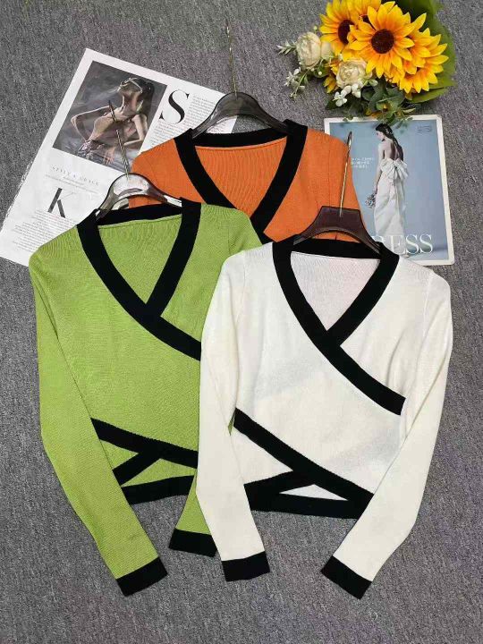 早秋季新款洋气交叉辣妹设计感小众长袖针织套头毛衣,独立包装,均码面料柔...