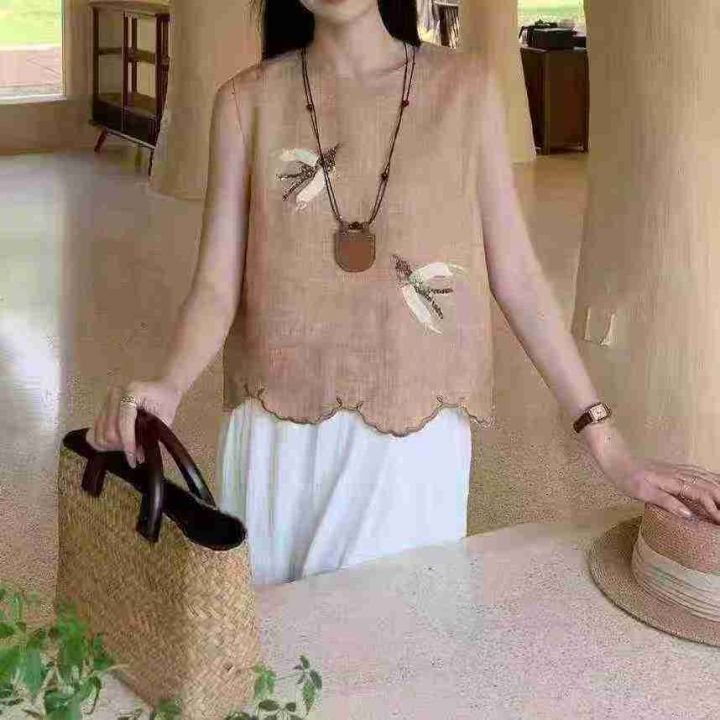 上新全清:10.8一件气质老钱风独特刺绣亚麻无袖上衣,[爱心]65件左右,款号...