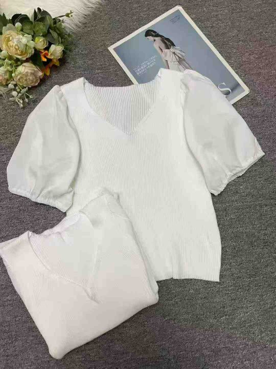 夏季新款法式复古v领雪纺拼接泡泡袖冰丝短袖针织小衫,独立包装,均码面料...