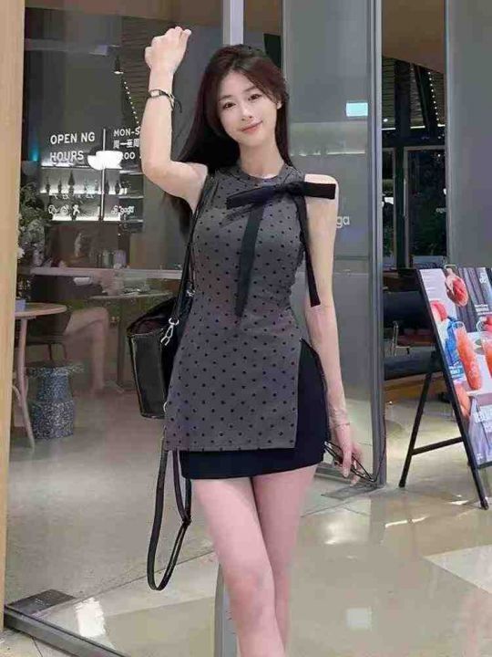 全清价6.8元捡漏173件灰色波点时尚辣妹圆领无袖背心纯欲风蝴蝶结开叉不规则...