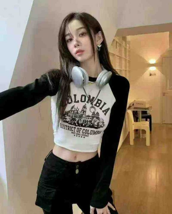 棉质欧货2025新款秋装美式插肩打底衫女内搭辣妹紧身上衣洋气长袖t恤,系列...