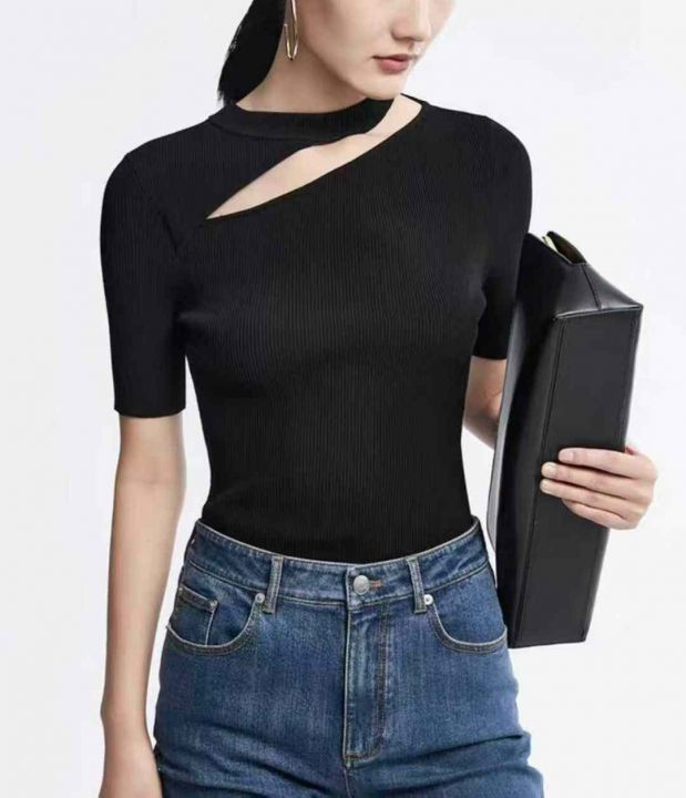 夏季新款时尚心机挂肩挖空露锁骨短袖针织小衫,独立包装,均码面料柔软舒适...