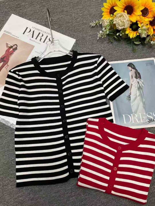 夏季新款撞色条纹冰丝曲珠针织短袖开衫,独立包装,均码面软糯舒适弹力大,...