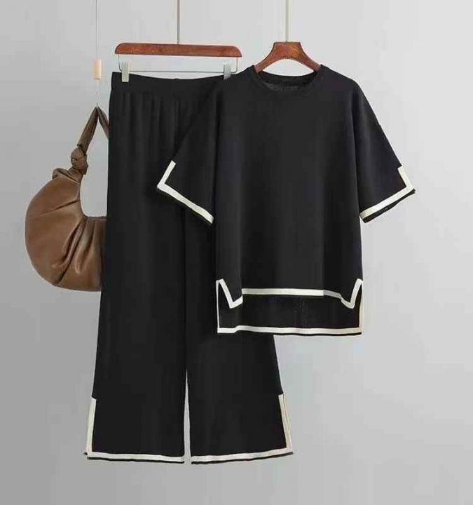 夏季复古慵懒风撞色宽松百搭针织上衣高腰显瘦长裤两件套女,码数S-XL码,面...