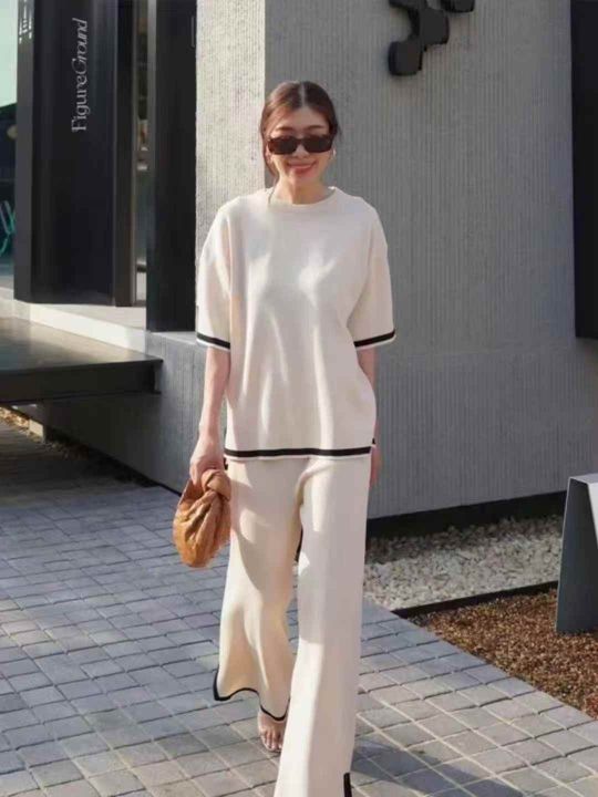 夏季复古慵懒风撞色宽松百搭针织上衣高腰显瘦长裤两件套女,码数S-XL码,面...