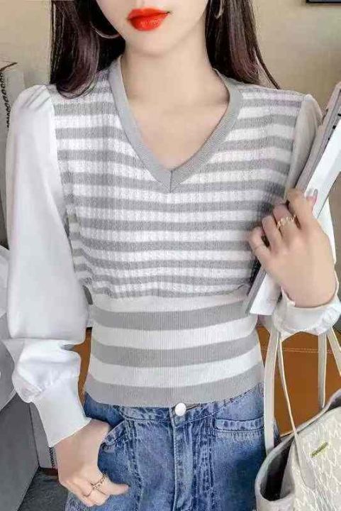 秋季新款雪纺拼接袖撞色条纹针织长袖套头毛衣,独立包装,均码面料柔软舒适...