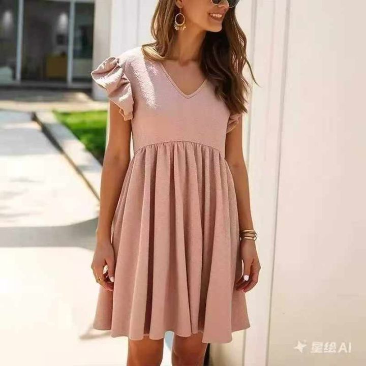 大码欧美度假风木耳边V领飞飞袖连衣裙夏季新款复古拼接褶皱长裙码数:XL-5...