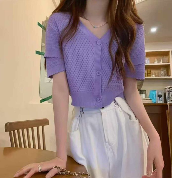 夏季新款法式小香风短款宽松洋气显瘦镂空短袖冰丝针织开衫,独立包装,均码...