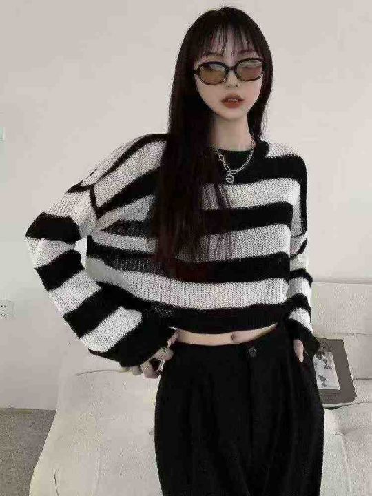 早秋新款靓妹短款宽松撞色黑白条纹针织长袖小衫,带配饰有垫肩(个别没有配...