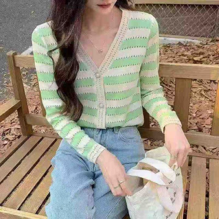 第二批回货,秋季新款复古条纹v领宽松小香风设计感遮肚显瘦长袖针织开衫,...