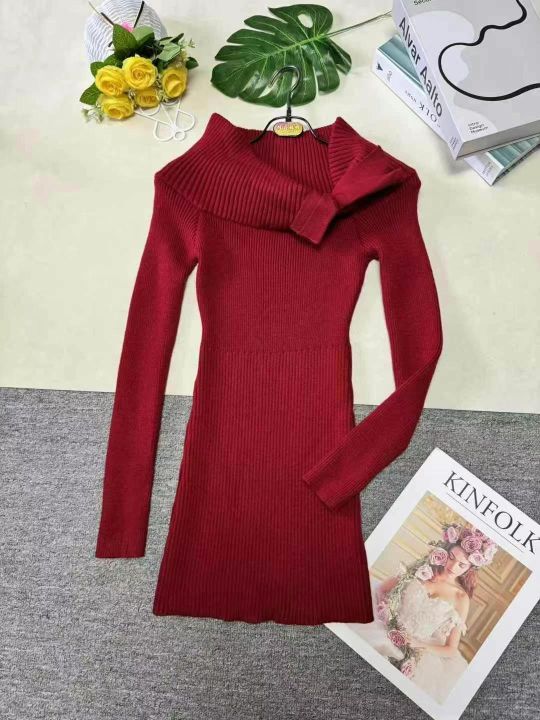 名媛气质蝴蝶结一字领包臀显瘦性感针织连衣裙女,单款单色,高弹力,面料厚...