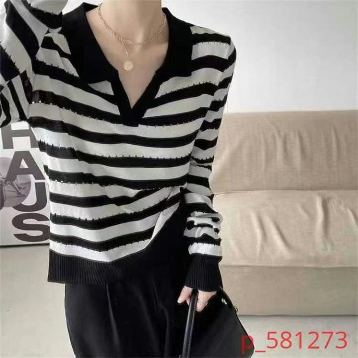 初秋新款复古设计感镂空条纹polo领针织套头毛衣,独立包装,均码面料柔软舒...